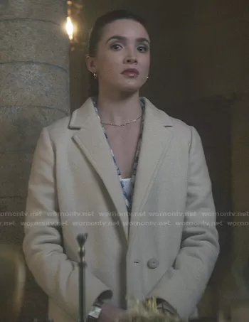 Bess (played by Maddison Jaizani) on Nancy Drew on The CW was spotted wearing this ivory wool coat on Nancy Drew on episode 'The Burning of the Sorrows' (3x08) in Dec 2021. Bess's Coat is the The Stedman Coat by Babaton.