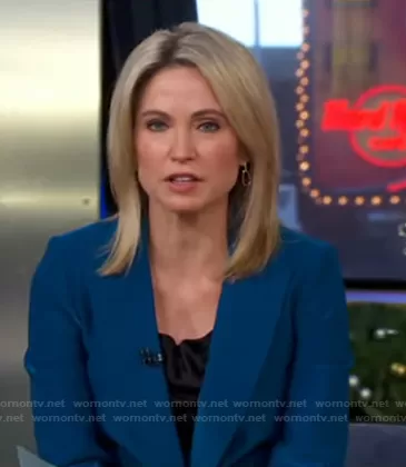 Amy Robach on Good Morning America on ABC was spotted wearing this blue blazer on Good Morning America on Dec 06 2021's episode. Amy's Jacket is the Long & Lean Dickey Jacket by Veronica Beard.