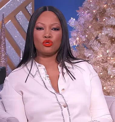 Garcelle Beauvais on The Real on BETher was spotted wearing this white rhinestone-trim blouse on The Real on Dec 03 2021's episode. Garcelle's Top is the Jewel Shirt by Zara.