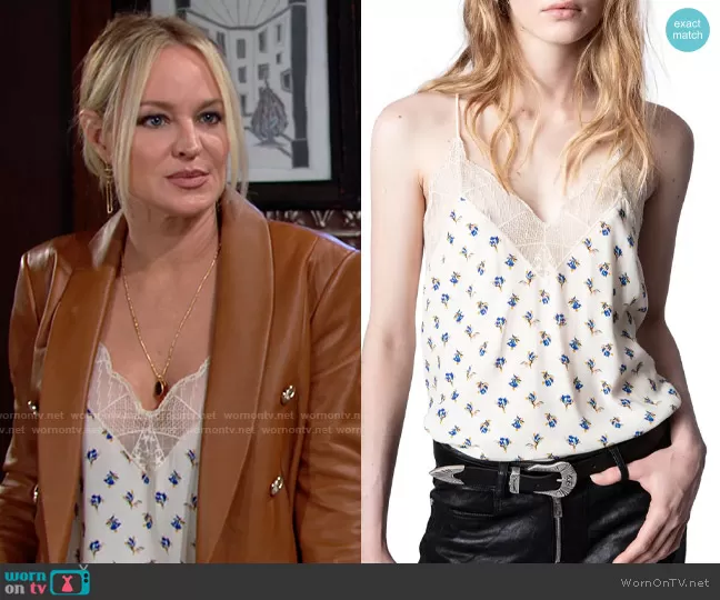 Sharon Newman (played by Sharon Case) on The Young and the Restless on CBS was spotted wearing this floral lace trim cami and leather blazer on The Young and the Restless on Dec 07 2021's episode. Sharon's Top is the Christy Camisole in Vanille by Zadig & Voltaire . Sharon's Jacket is the Roxanne Genuine Leather Blazer by Guess.