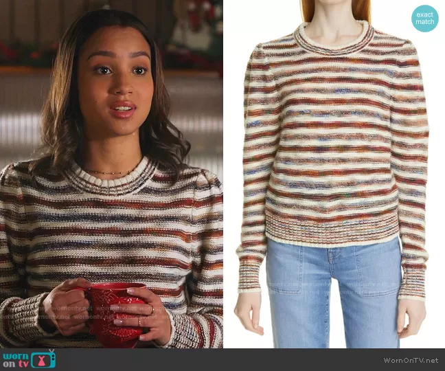 May Grant (played by Corinne Massiah) on 9-1-1 on ABC was spotted wearing this striped knit sweater on 9-1-1 on episode 'Wrapped in Red' (5x10) in Dec 2021. May's Sweater is the Raissa Crewneck Pullover by Veronica Beard.