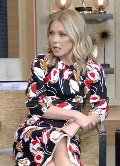 Kelly Ripa on Live with Kelly and Mark on Disney ABC Home Entertainment was spotted wearing this black tulip print dress on Live with Kelly and Ryan on Sep 01 2022's episode. Kelly's Dress is the Tulip-Print Mid-Length Dress by Marni.