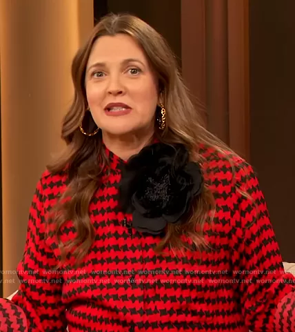 Drew Barrymore on The Drew Barrymore Show on CBS was spotted wearing this red houndstooth blouse and skirt on The Drew Barrymore Show on Dec 07 2021's episode. Drew's Top is the Houndstooth Blouse by Victoria Beckham . Drew's Skirt is the Houndstooth Pleated Skirt by Victoria Beckham.