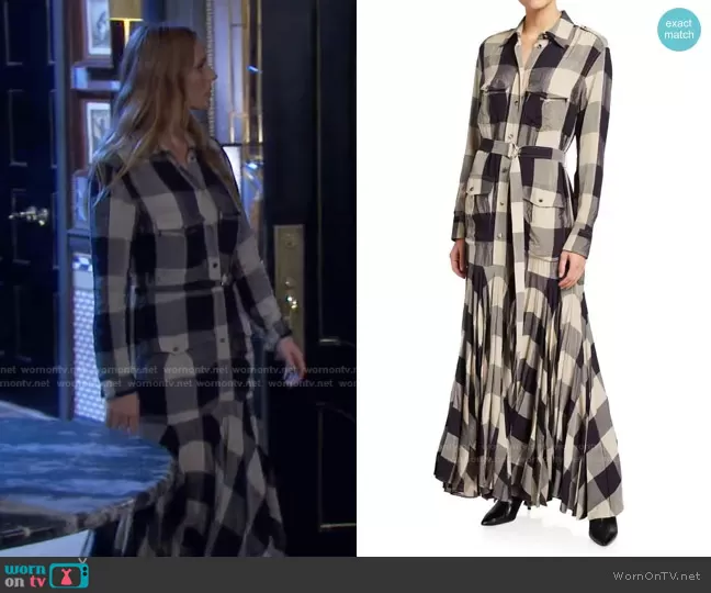 Abigail Deveraux (played by Marci Miller) on Days of our Lives on Peacock was spotted wearing this blue check shirtdress on Days of our Lives on Dec 08 2021's episode. Abigail's Dress is the Lyla Check Long Sleeve Pleated Shirtdress by Khaite.
