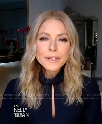 Kelly Ripa on Live with Kelly and Mark on Disney ABC Home Entertainment was spotted wearing this navy keyhole midi dress on Live with Kelly and Ryan on Jan 04 2022's episode. Kelly's Dress is the Solange Asymmetric Crepe Dress by Officine Generale . Kelly's Shoes is the Suede Pumps by by Gianvito Rossi.