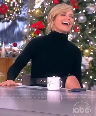 Sara Haines on The View on ABC was spotted wearing this black turtleneck dress on The View on Dec 08 2021's episode. Sara's Dress is the Alpaca turtleneck midi dress by Sergio Hudson . Sara's Belt is the Signature Buckle Leather Belt Sergio Hudson.