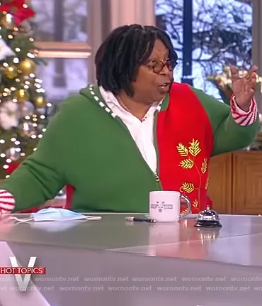 Whoopi Goldberg on The View on ABC was spotted wearing this green christmas hoodie on The View on Dec 08 2021's episode. Whoopi's Sweater is the Festive Sweater Knit Zip-Up Hoodie by Whoopi.