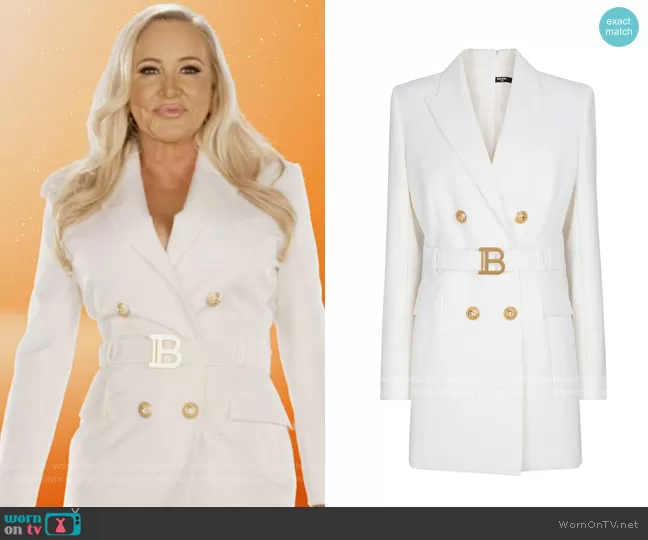 Shannon Beador on The Real Housewives of Orange County on Bravo was spotted wearing this white belted blazer dress on The Real Housewives of Orange County on episode 'Loose Lips and Lawsuits' (16x02) in Dec 2021. Shannon's Dress is the B-logo blazer-style Minidress by Balmain.