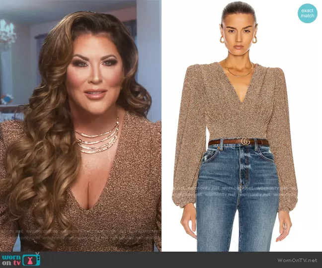 Emily Simpson on The Real Housewives of Orange County on Bravo was spotted wearing this lurex bodysuit on The Real Housewives of Orange County on episode 'Loose Lips and Lawsuits' (16x02) in Dec 2021. Emily's Bodysuit is the Lurex Plunge Bodysuit by Patbo.