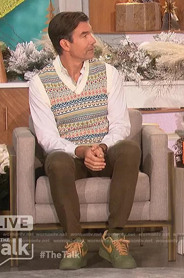 Jerry O'Connell on The Talk on CBS was spotted wearing this fairisle knit vest on The Talk on Dec 09 2021's episode. Jerry's Vest is the Jacquard Knit Vest by Zara.