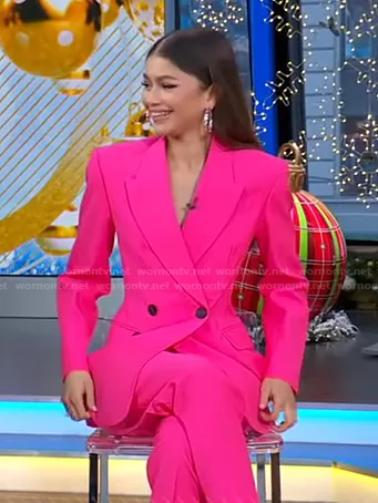 on Good Morning America on ABC was spotted wearing this pink double breasted blazer on Good Morning America on Dec 10 2021's episode. 's Suit is the Spring 2022 Collection by Alexander McQueen.