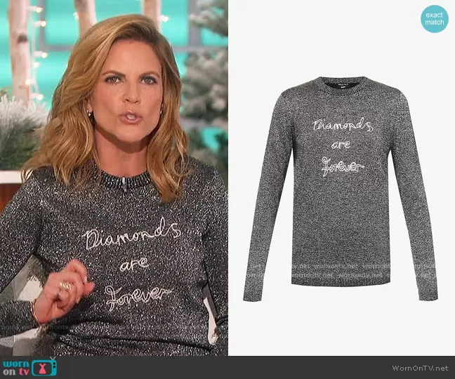Natalie Morales on The Talk on CBS was spotted wearing this metallic Diamonds are Forever sweater on The Talk on Dec 10 2021's episode. Natalie's Sweater is the Diamonds Are Forever metallic wool-blend jumper by Bella Freud.