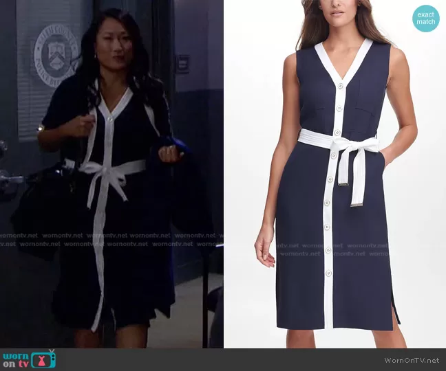 Melinda Trask (played by Tina Huang) on Days of our Lives on Peacock was spotted wearing this navy contrast trim button front dress on Days of our Lives on Dec 11 2021's episode. Melinda's Dress is the Contrast-Trim Sheath Dress by Tommy Hilfiger.