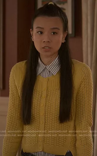 (played by ) on The Sex Lives of College Girls on HBO was spotted wearing this yellow knit cardigan on The Sex Lives of College Girls on episode 'The Truth' (1x10) in Dec 2021. 's Sweater is the Pointelle Cable Cardigan in Gold from Anthropologie.