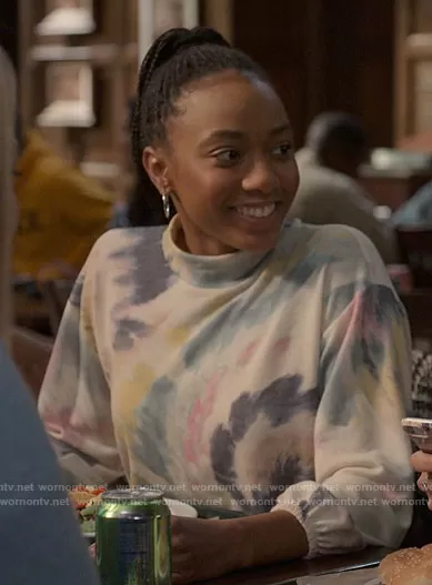 Whitney Chase (played by Alyah Chanelle Scott) on The Sex Lives of College Girls on HBO was spotted wearing this tie dye mock neck sweatshirt on The Sex Lives of College Girls on episode 'The Truth' (1x10) in Dec 2021. Whitney's Top is the Mock Neck Top by All in Favor.