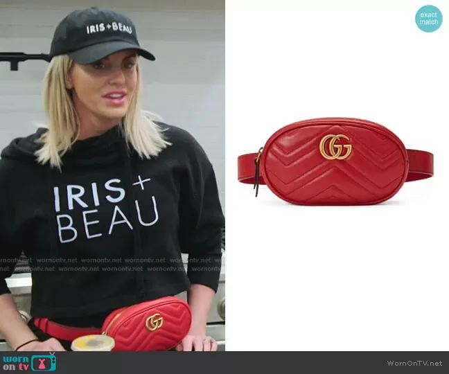 Whitney Rose on The Real Housewives of Salt Lake City on Bravo was spotted wearing this red quilted belt bag on The Real Housewives of Salt Lake City on episode 'Fair Weather Friends' (2x13) in Dec 2021. Whitney's Bag is the GG Matelassé Leather Belt Bag by Gucci.