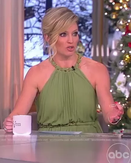 Sara Haines on The View on ABC was spotted wearing this greenpleated sleeveless dress on The View on Dec 13 2021's episode. Sara's Dress is the Sunray Pleated Dress by Zimmermann.