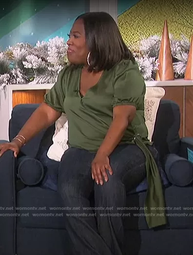 Sheryl Underwood on The Talk on CBS was spotted wearing this green wrap top on The Talk on Dec 13 2021's episode. Sheryl's Top is the Puff-Sleeve Wrap Top by MICHAEL Michael Kors.