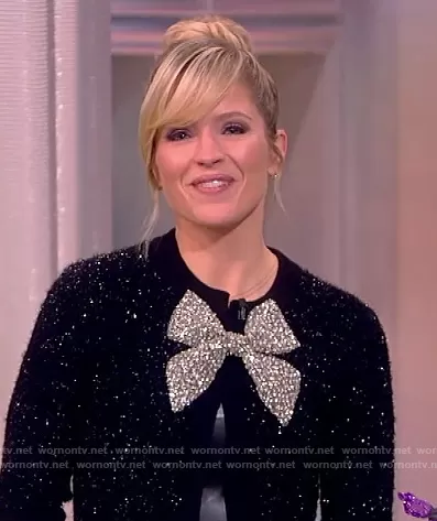 Sara Haines on The View on ABC was spotted wearing this black metallic bow embellished sweater on The View on Dec 14 2021's episode. Sara's Sweater is the Akira Textured Cardigan with Embellished Bow by Alice + Olivia.