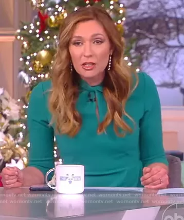 on The View on ABC was spotted wearing this green twist neck dress on The View on Dec 14 2021's episode. 's Dress is the Twisted Neck 3/4 Sleeve Sheath Dress by Donna Morgan.