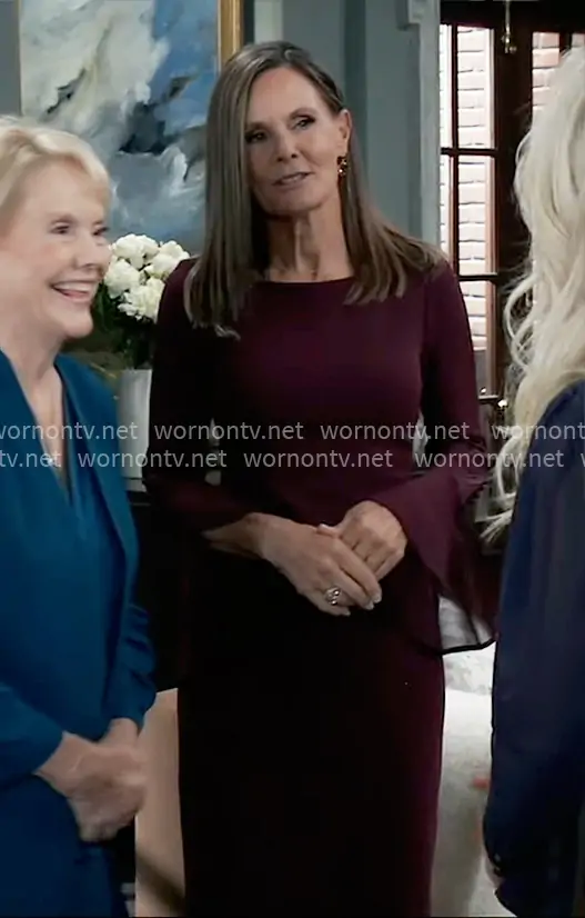 Lucy Coe (played by Lynn Herring) on General Hospital on ABC was spotted wearing this burgundy bell sleeve dress on General Hospital on Oct 20 2025's episode. Lucy's Dress is the Chiffon Bell Sleeve Sheath Dress by Calvin Klein.