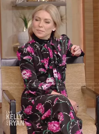 Kelly Ripa on Live with Kelly and Mark on Disney ABC Home Entertainment was spotted wearing this black floral tie neck dress on Live with Kelly and Ryan on Mar 16 2022's episode. Kelly's Dress is the Floral-Print Neck-Tie Silk Midi Dress with Lace Trim by Rodarte . Kelly's Shoes is the Ellipsis Pointed Pumps by Gianvito Rossi.