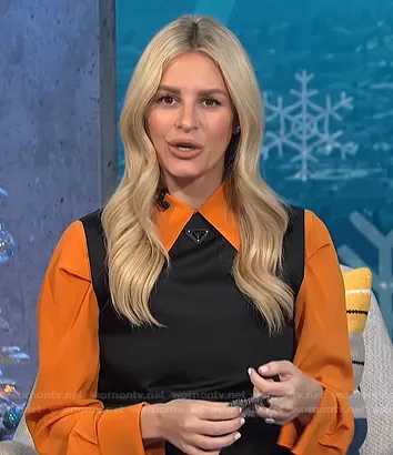 Morgan Stewart on E! News on E! was spotted wearing this orange shirt and Prada black dress on E! News Daily Pop on Dec 15 2021's episode. Morgan's Top is the Button Down Shirt by Saint Laurent . Morgan's Dress is the Re-Nylon Gabardine Sleeveless Dress by Prada . Morgan's Shoes is the Pointed-Toe Leather Boots by Amina Muaddi.
