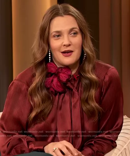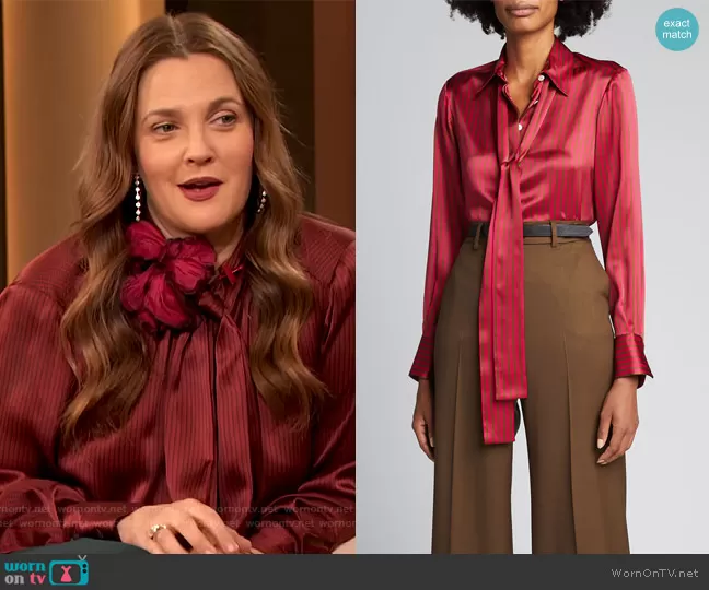 Drew Barrymore on The Drew Barrymore Show on CBS was spotted wearing this red satin stripe blouse on The Drew Barrymore Show on Dec 15 2021's episode. Drew's Top is the Striped Scarf-Neck Silk Blouse by Kiton.