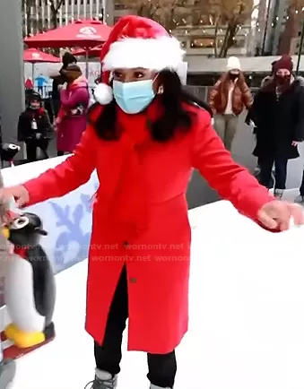 Sheinelle Jones on Today on NBC was spotted wearing this red coat on Today on Dec 15 2021's episode. Sheinelle's Coat is the Classic Lady Day Coat by J. Crew.