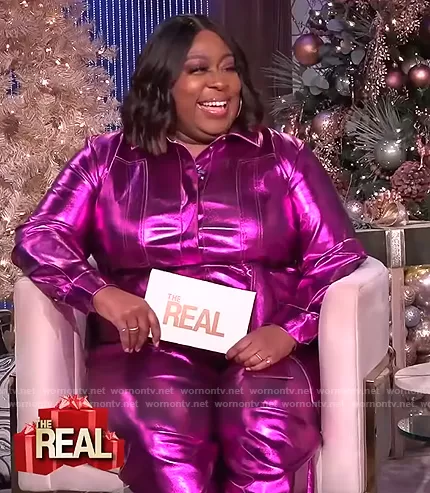 Loni Love on The Real on BETher was spotted wearing this pink metallic jumpsuit on The Real on Dec 15 2021's episode. Loni's Jumpsuit is the Metallic Tie Ankle Jumpsuit by Eloquii.