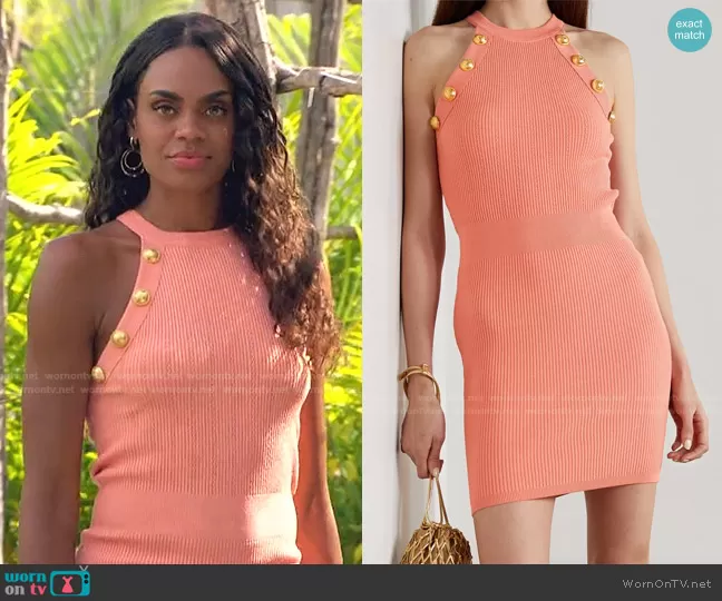 Michelle Young on The Bachelorette on ABC was spotted wearing this pink button embellished ribbed dress on The Bachelorette on episode 'Week 9' (18x09) in Dec 2021. Michelle's Dress is the Button-Embellished Ribbed-Knit Mini Dress by Balmain . Michelle's Earrings is the Dia Double Hoop Cluster Earrings by Brevani.