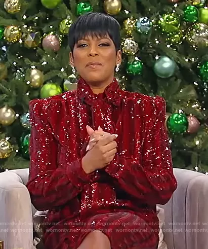 Tamron Hall on Tamron Hall Show on ABC was spotted wearing this red sequin stripe dress on Tamron Hall Show on Dec 15 2021's episode. Tamron's Dress is the Pussy-bow striped sequined silk-crepe midi dress by Saint Laurent.