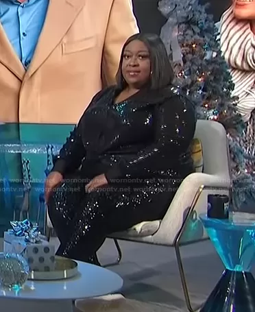 Loni Love on E! News on E! was spotted wearing this black sequin top and pants on E! News Daily Pop on Dec 16 2021's episode. Loni's Top is the Sequin Me Top by Eleven 60 . Loni's Pants is the Miracle Flawless Legging with Sequin Front by Eloquii.