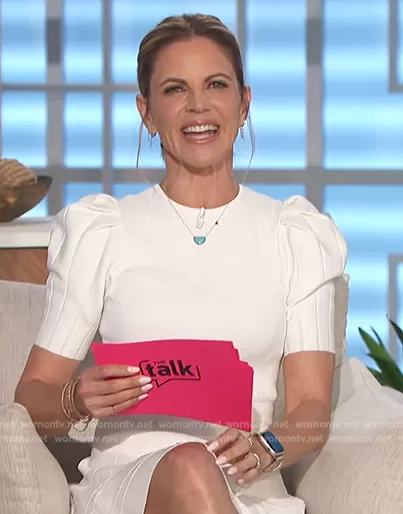 Natalie Morales on The Talk on CBS was spotted wearing this white puff sleeve mini dress on The Talk on May 01 2023's episode. Natalie's Dress is the Velvey Dress by Ted Baker.