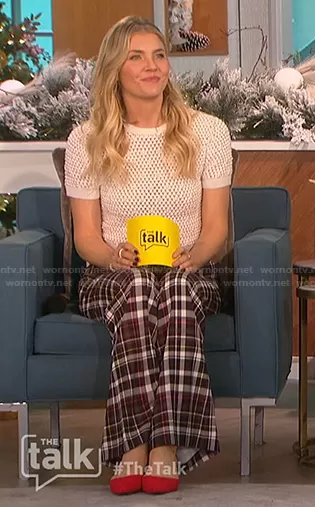 Amanda Kloots on The Talk on CBS was spotted wearing this white pearl crochet top and plaid pants on The Talk on Dec 16 2021's episode. Amanda's Top is the Ciara Pearl Crochet Top by Alice + Olivia . Amanda's Pants is the Dylan Pants in Freedom Plaid Black by Alice + Olivia.