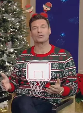 on Live with Kelly and Mark on Disney ABC Home Entertainment was spotted wearing this basketball net ugly Christmas sweater on Live with Kelly and Ryan on Dec 17 2021's episode. 's Sweater is the Basketball Net 3D Ugly Christmas Sweater by Ugly Christmas Sweater.
