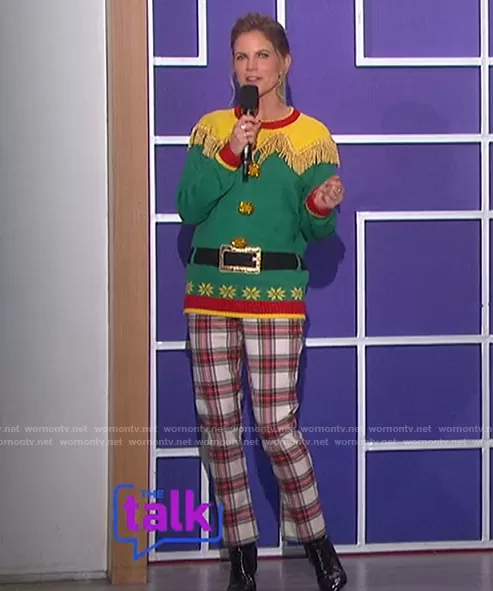 Natalie Morales on The Talk on CBS was spotted wearing this green elf Christmas sweater and pants on The Talk on Dec 17 2021's episode. Natalie's Sweater is the Elf Christmas Sweater by Blizzard Bay . Natalie's Pants is the Pop Pant by Trina Turk.