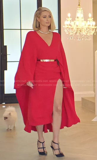 Paris Hilton on Paris in Love on Peacock was spotted wearing this red v-neck cape dress on Paris in Love on episode 'The Unengaged Bride' (1x01) in Nov 2021. Paris's Dress is the Silk Cape Dress by Valentino . Paris's Shoes is the Rockstud Ankle Strap Pump by Valentino.