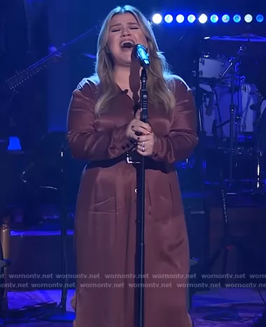 Kelly Clarkson on The Kelly Clarkson Show on NBC was spotted wearing this brown satin midi dress on The Kelly Clarkson Show on Dec 20 2021's episode. Kelly's Dress is the Satin Midi Dress by Mango.