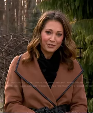 Ginger Zee on Good Morning America on ABC was spotted wearing this brown leather trim wrap coat on Good Morning America on Dec 21 2021's episode. Ginger's Coat is the Juliette Coat by Tahari.