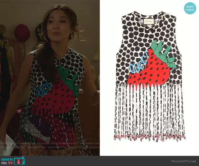 Mindy Chen (played by Ashley Park) on Emily in Paris on Netflix was spotted wearing this strawberry print fringe tank on Emily in Paris on episode 'Voulez-Vous Coucher Avec Moi?' (2x01) in Dec 2021. Mindy's Top is the Fringe tank with Gucci Strawberry print by Gucci.