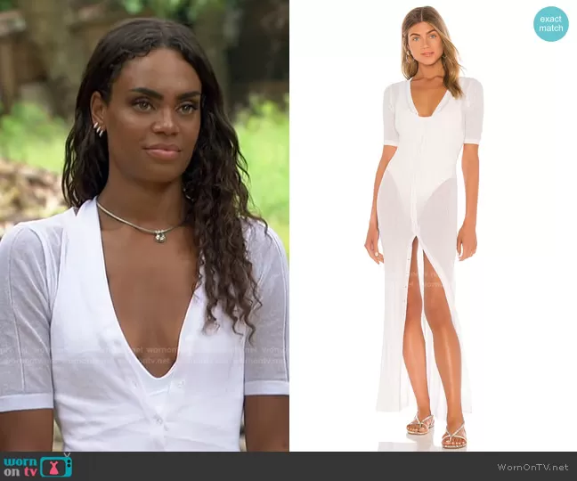 Michelle Young on The Bachelorette on ABC was spotted wearing this white button front maxi dress on The Bachelorette on episode 'Week 10' (18x10) in Dec 2021. Michelle's Dress is the Sevilla Knit Maxi Dress by Superdown . Michelle's Necklace is the Droplet Necklace by Samuel B . Michelle's Earrings is the Kaslique Diamond Stud Earrings by Gabriel & Co . Michelle's Shoes is the Mareki Chain Thong Sandals by Manolo Blahnik.