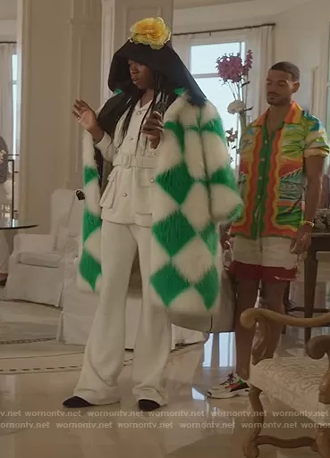 (played by ) on Emily in Paris on Netflix was spotted wearing this diamond print fur coat on Emily in Paris on episode 'Do You Know the Way to St. Tropez?' (2x02) in Dec 2021. 's Jacket is the Belted Single Breasted Jacket by Casablanca . 's Coat is the Diamond-check Faux-fur Coat by Casablanca.