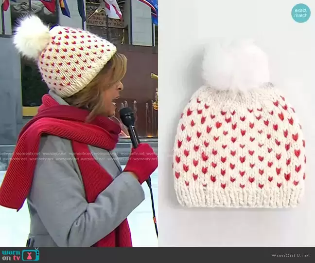 Hoda Kotb on Today on NBC was spotted wearing this white heart knit pom pom beanie on Today on Mar 11 2024's episode. Hoda's Hat is the Heart and Soul Fair Isle Pom-Pom Hat by Modcloth.