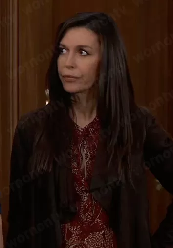 Anna Devane (played by Finola Hughes) on General Hospital on ABC was spotted wearing this red paisley print blouse on General Hospital on May 16 2023's episode. Anna's Top is the Camill Printed Blouse by Gerard Darel.