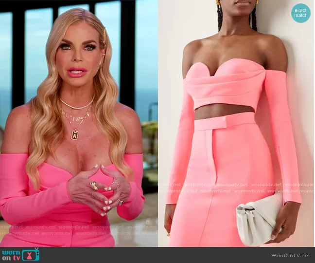 Alexia Echevarria (played by Alexia Echevarria) on The Real Housewives of Miami on Peacock was spotted wearing this pink sweetheart top on The Real Housewives of Miami on episode 'Bienvenidos! Same Beaches, New Shade' (4x01) in Dec 2021. Alexia's Top is the Loren Stretch Crepe Cropped Top by Alex Perry . Alexia's Skirt is the Delany Stretch Crepe Midi Skirt by Alex Perry.