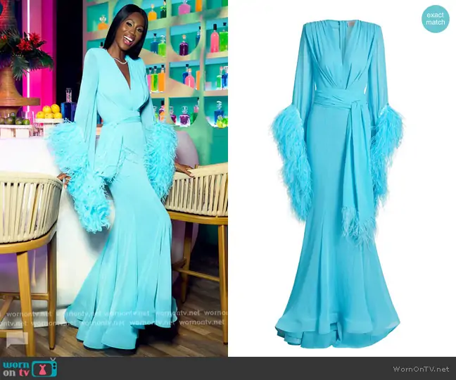 Marysol Patton (played by Marysol Patton) on The Real Housewives of Miami on Peacock was spotted wearing this confessional dress on The Real Housewives of Miami on episode 'Bienvenidos! Same Beaches, New Shade' (4x01) in Dec 2021. Marysol's Dress is the Feather-trim Fitted Mini Dress by Loulou.