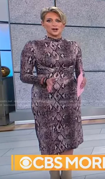 Jamie Yuccas on CBS Mornings on CBS was spotted wearing this snake print long sleeve dress on CBS Mornings on Dec 30 2021's episode.