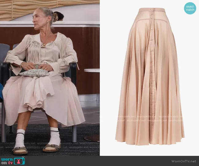 Carrie Bradshaw (played by Sarah Jessica Parker) on And Just Like That on HBO was spotted wearing this pink midi skirt and sandals on And Just Like That on episode 'Tragically Hip' (1x05) in Dec 2021. Carrie's Skirt is the Flared Cotton Muslin Skirt by Alaia . Carrie's Socks is the Andre Rib Pom Socks by Free People . Carrie's Shoes is the Madrid Slide Sandal by Birkenstock .