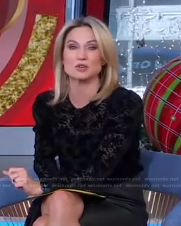 Amy Robach on Good Morning America on ABC was spotted wearing this black velvet burnout top on Good Morning America on Dec 31 2021's episode. Amy's Top is the Reverie Velvet Burnout Blouse by Veronica Beard . Amy's Earrings is the Heart Throb Earrings by Accessory Concierge.